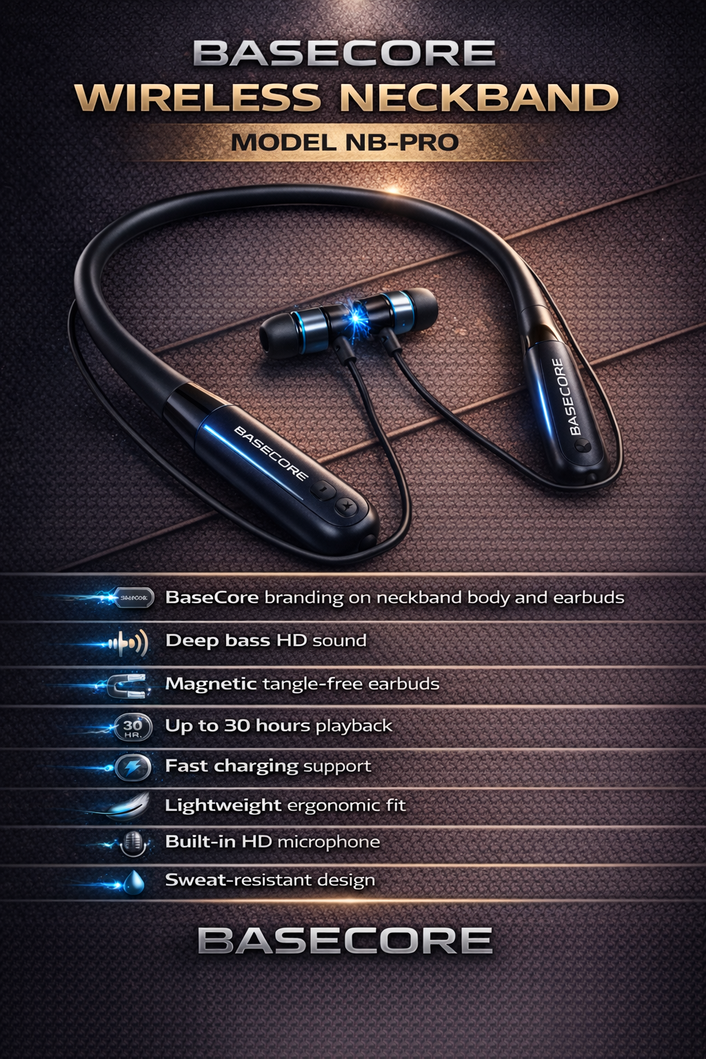 BaseCore NB-PRO Wireless Neckband Bluetooth Earphones | 30H Playback | Deep Bass HD Sound | Magnetic Earbuds | Fast Charging | Sweat-Resistant